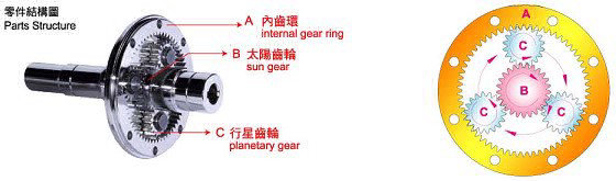 由一個內(nèi)齒環(huán)(A)緊密結(jié)合于齒箱殼體上,環(huán)齒中心有一個自外部動力所驅(qū)動之太陽齒輪(B),
